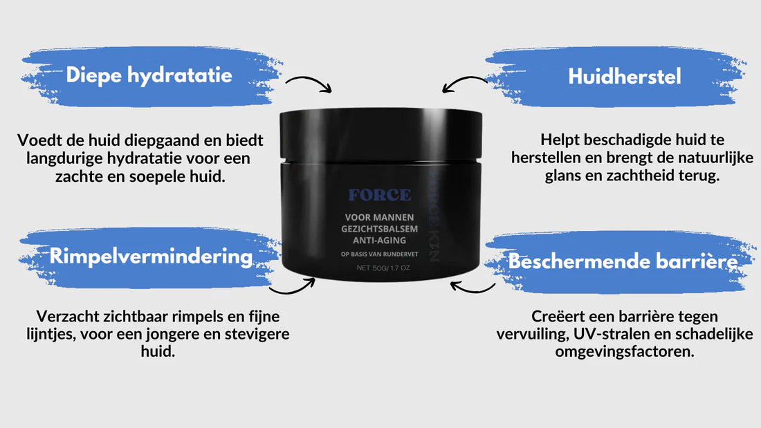 ForceSkin Anti-Ageing Balm is een hydraterende anti-rimpelcrème, verrijkt met rundertalg, speciaal geformuleerd om: